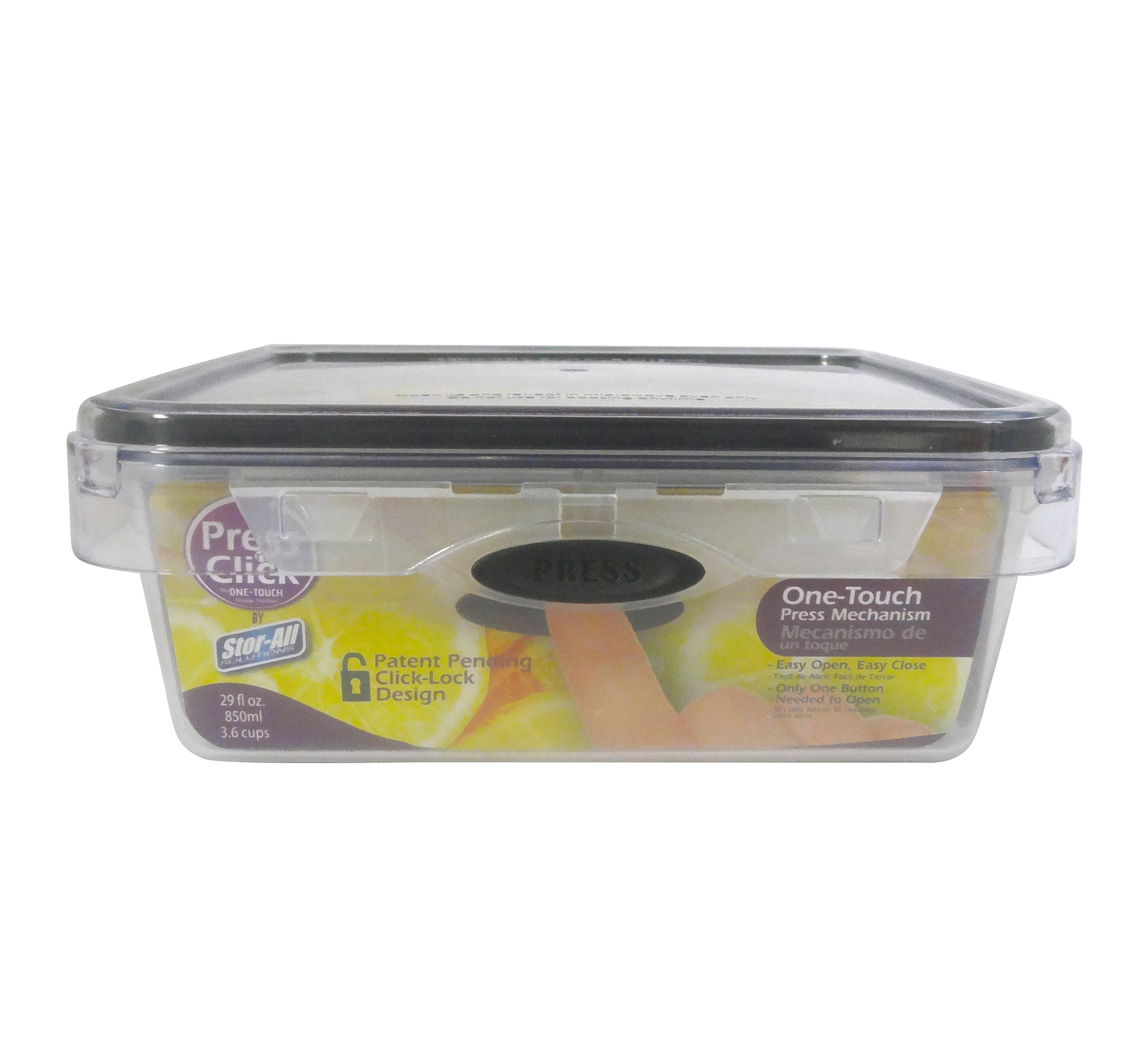 Press N' Click's patented, easy to use "One Touch" Press mechanism makes food storage a breeze! This container is both Air & Water Tight, keeping your food fresher longer without any unnecessary mess. All Press N' Click storage products are washable, feature Heat Resistant Handles to make carrying hot meals worry-free and are made from BPA Free virgin plastic. They are Microwave, Dishwasher & Freezer Safe and stack or nest easily on your counter or in your cupboard.
