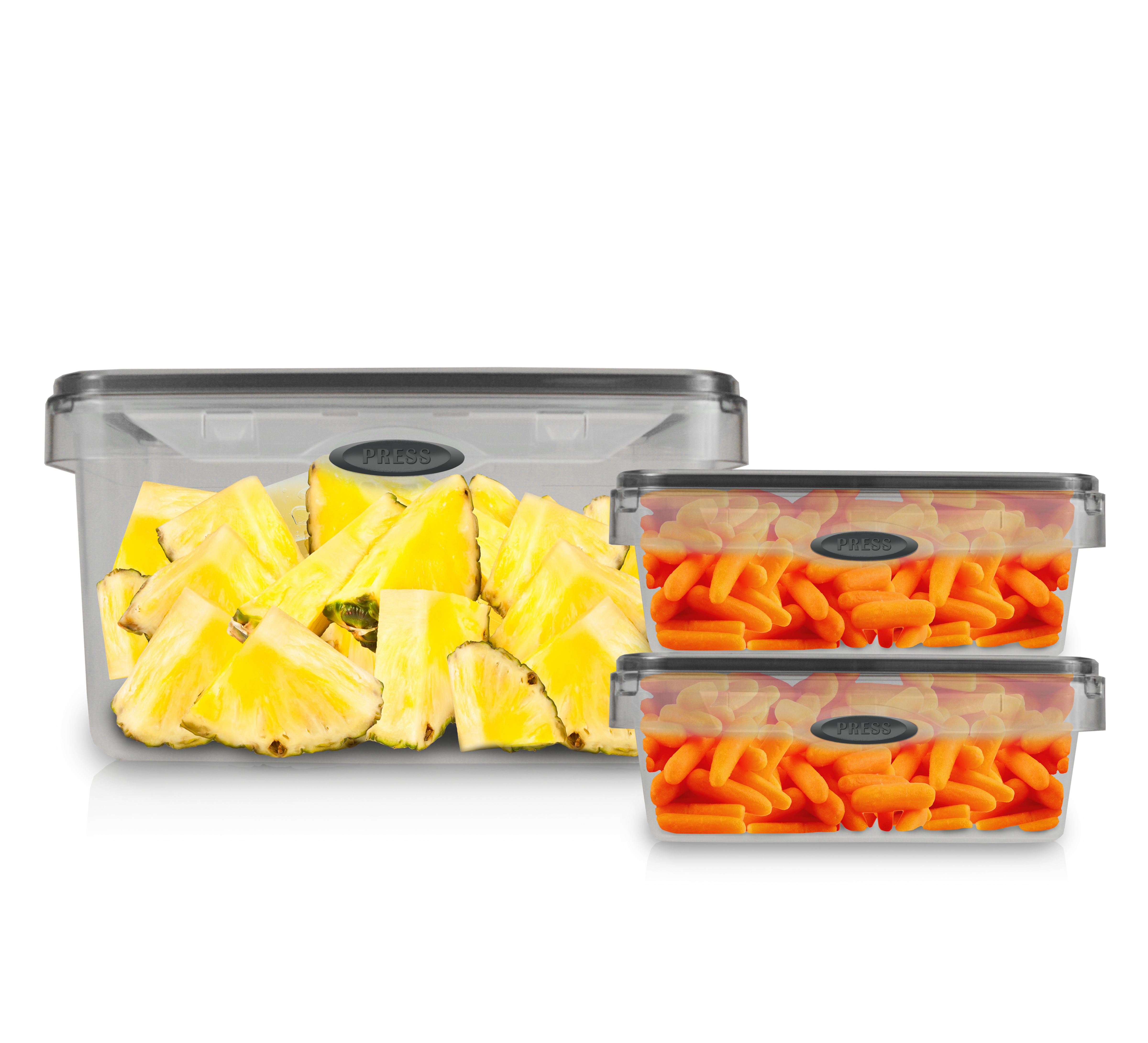Press N' Click's patented, easy to use "One Touch" Press mechanism makes food storage a breeze! This container set is both Air & Water Tight, keeping your food fresher longer without any unnecessary mess. All Press N' Click storage products are washable, feature Heat Resistant Handles to make carrying hot meals worry-free and are made from BPA Free virgin plastic. They are Microwave, Dishwasher & Freezer Safe and stack or nest easily on your counter or in your cupboard.